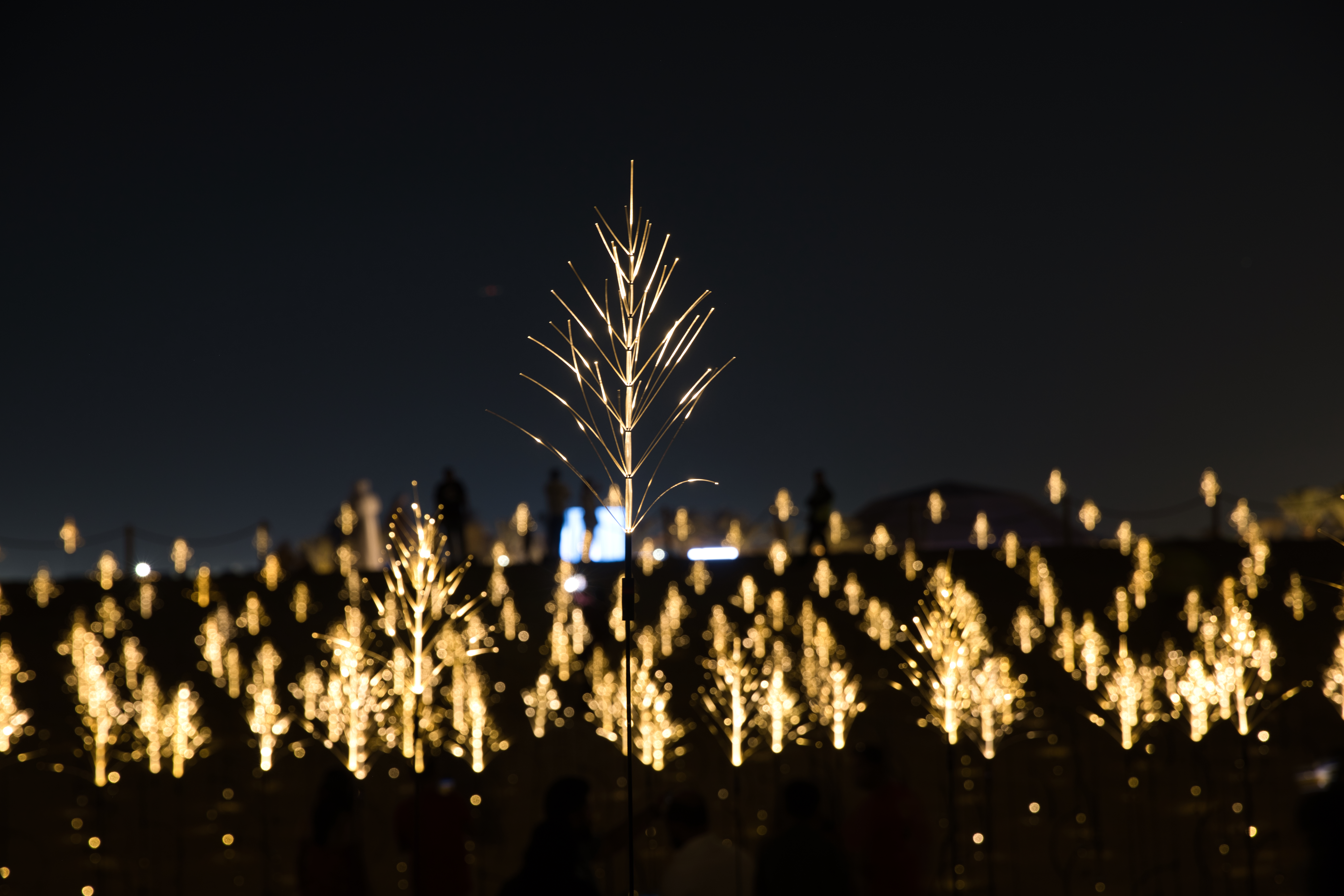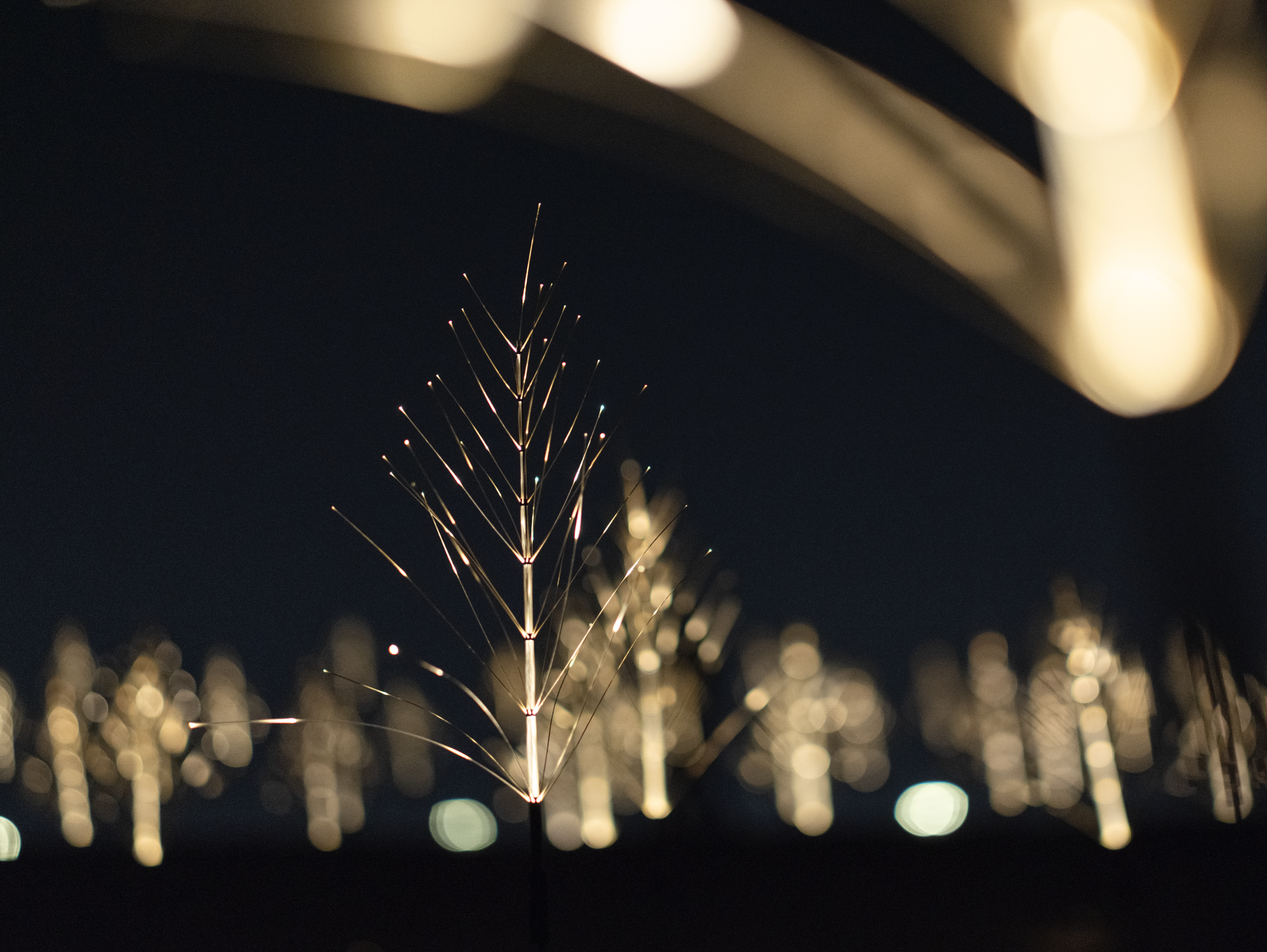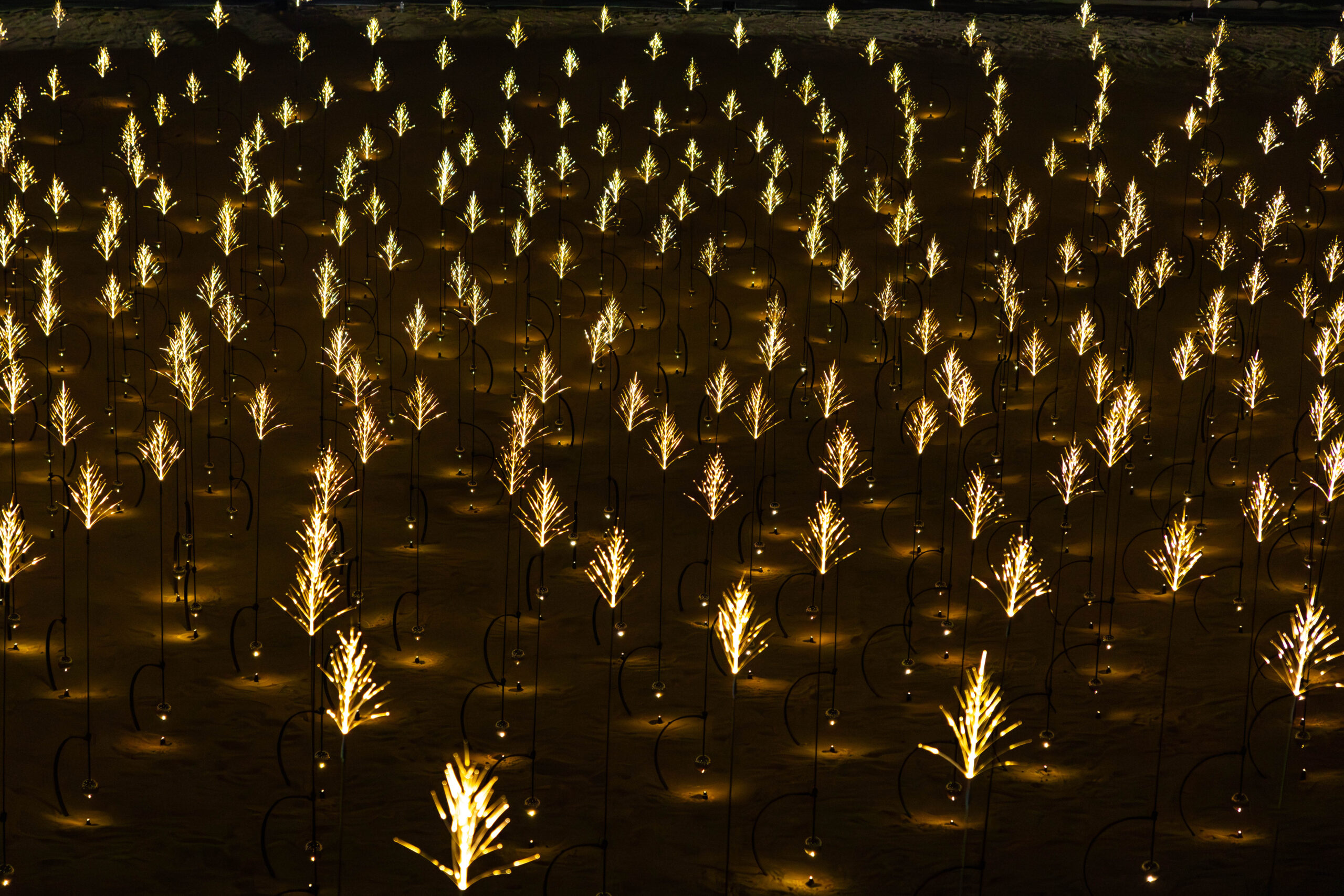 Inspired by the simple shape and perfect proportions of wild Guinea Grass, Whispers celebrates nature’s perfected solutions to move along and adapt with the elements. The uniformity of the 500 elements change while the wind plays with their flexibility. The whisper’s illuminated ends are at the same height as the visitors, so there is no hierarchy between people, installation and the surroundings. The wind moves the artwork to create a playful interactive light pattern. Whispers drops you back into that childhood moment of being small in a field of heaving grass, completely overtaken by nature.